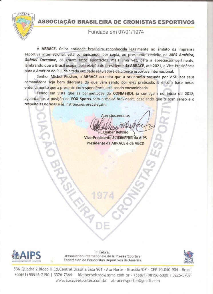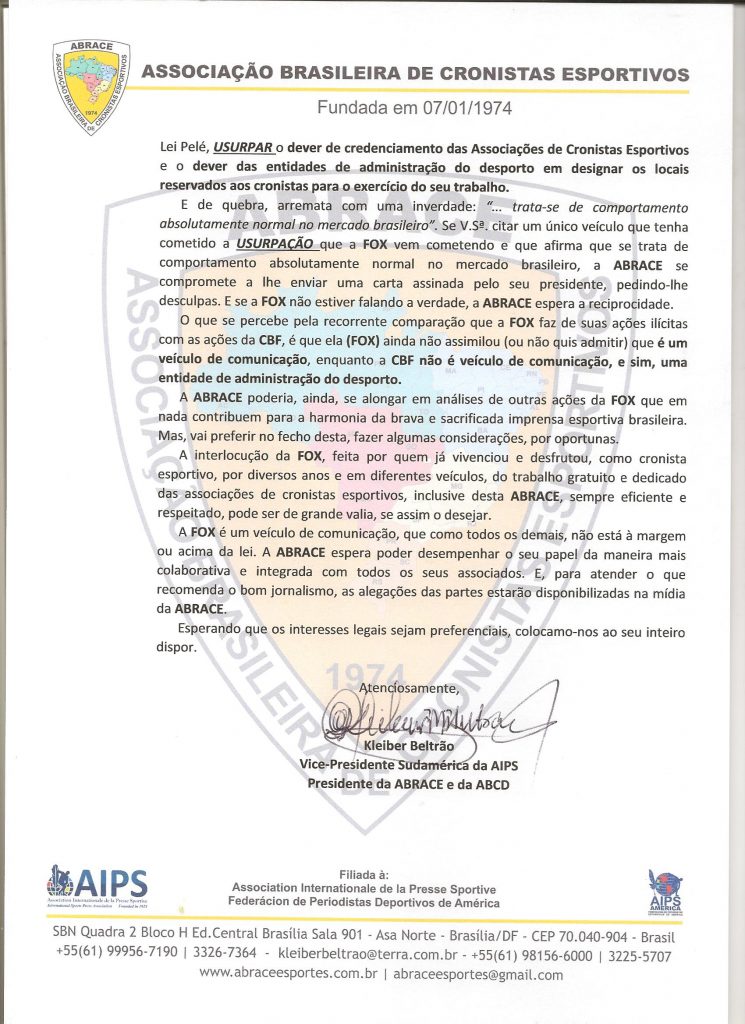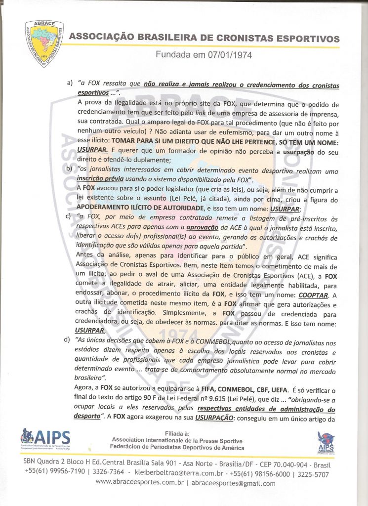 Em documento enviado ao grupo Fox Networks, o presidente da ABRACE, Kleiber Beltrão, ressalta a usurpação e a cooptação da atribuição das associações de classe por parte do Fox Sports, que é apenas – e tão só – detentor dos direitos de TRANSMISSÃO das competições da Conmebol.