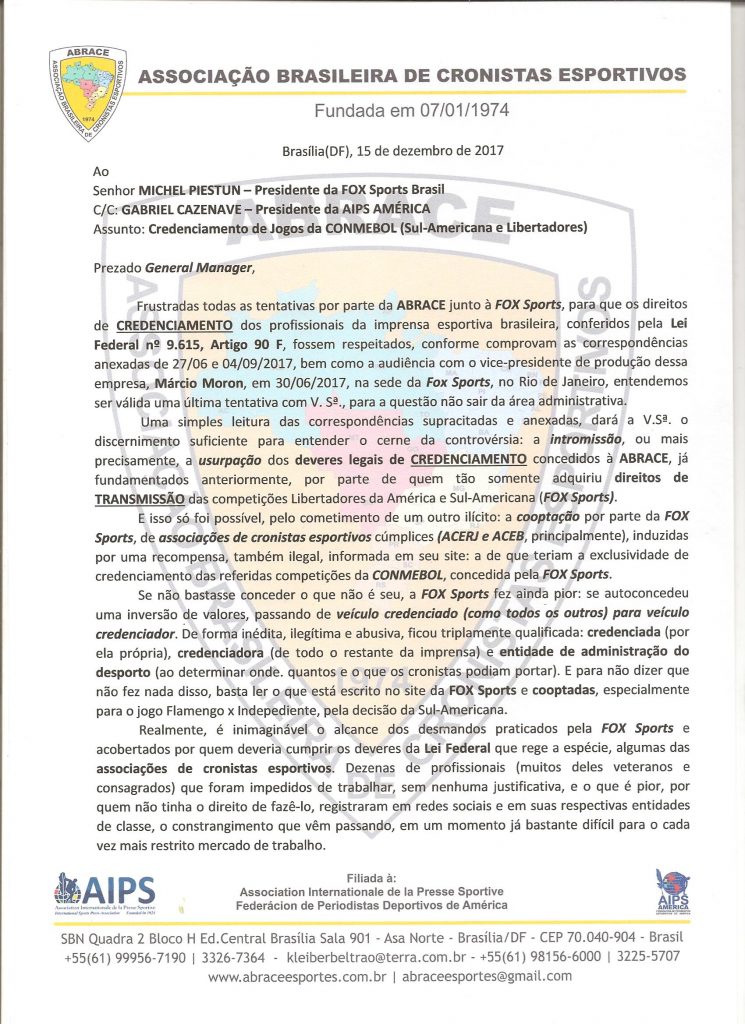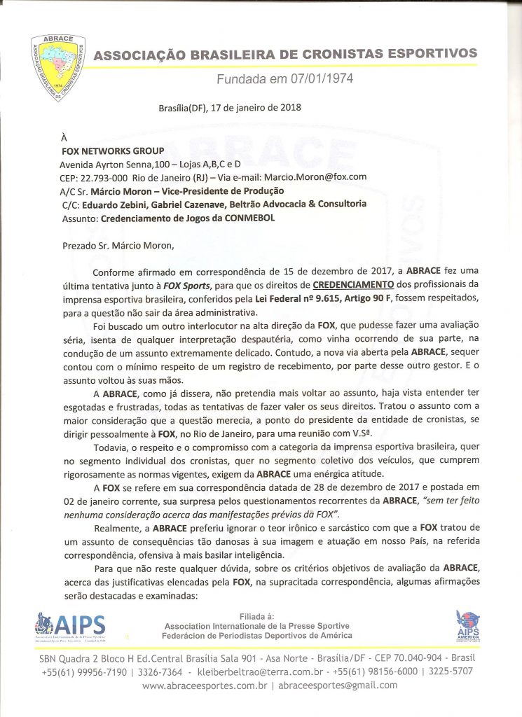 A seguir, a nova correspondência encaminhada pela ABRACE em 17 de janeiro de 2018, dando um ultimato ao grupo Fox Networks para não mais atuar de forma ilegal no credenciamento de cronistas: